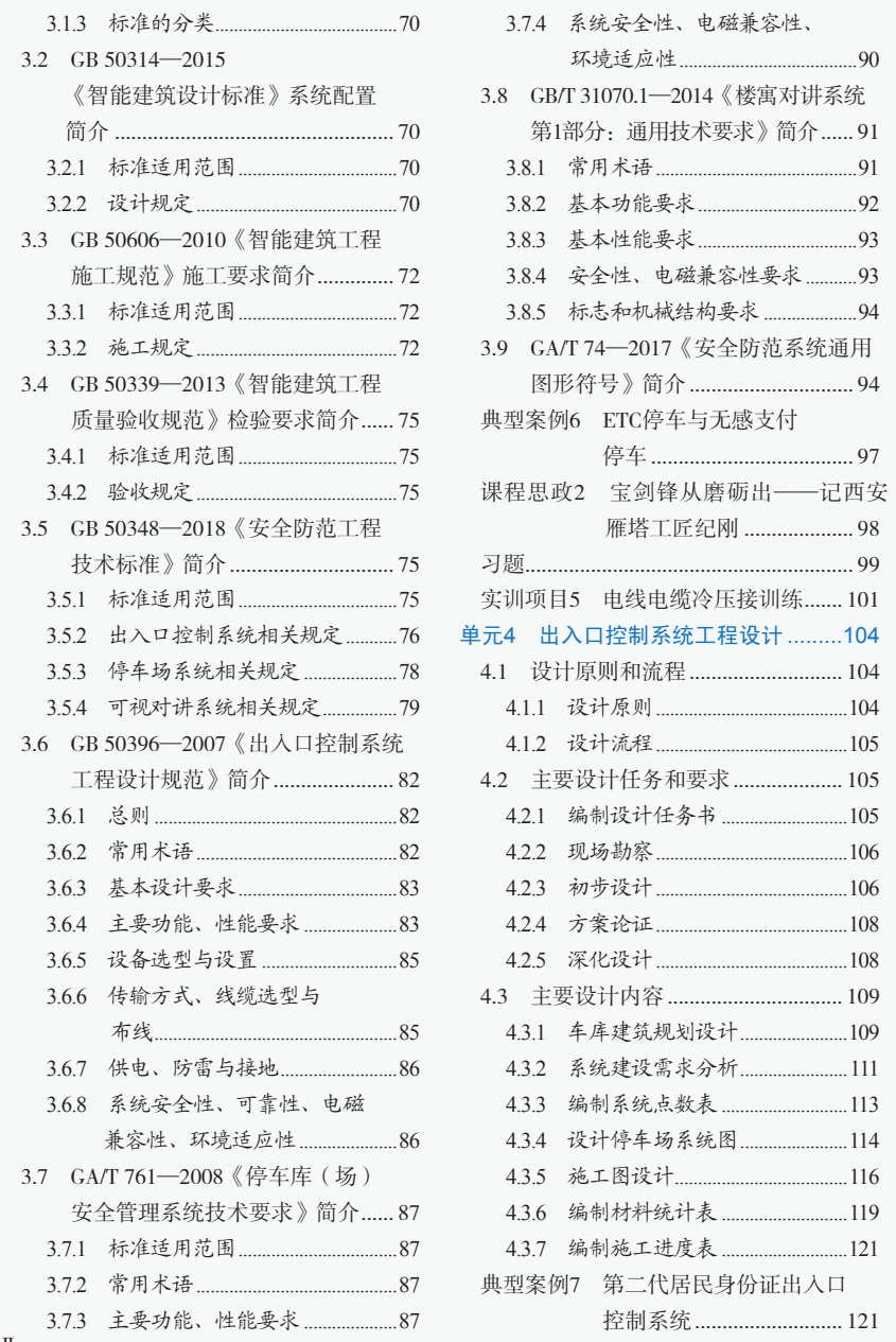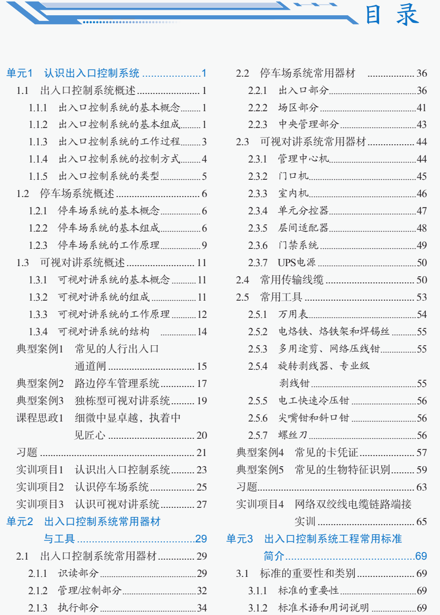 本教材依据GB50396《出入口控制系统工程设计规范》等现行国家标准宣贯和落地实施需求,按照相关职业标准和企业岗位工作流程精心安排专业技能训练内容与方法,包括系统认知、基本技能操作、设备安装、系统调试等。全书共分6个单元,目录如下。